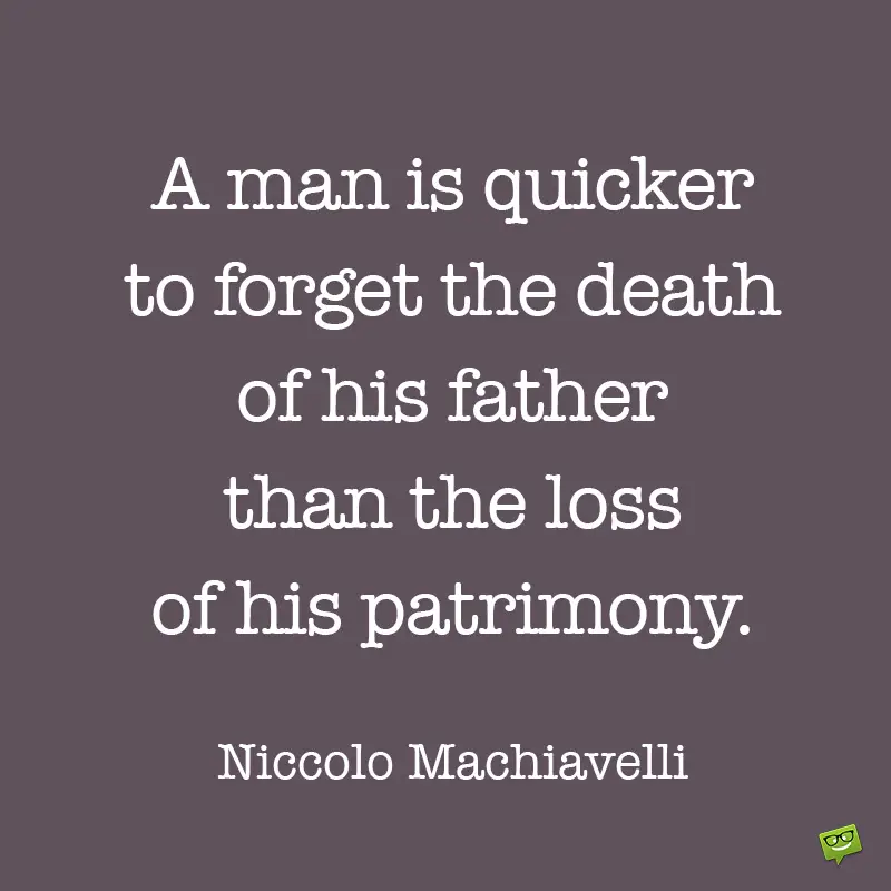 - A man is quicker to forget the death of his father than the loss of his patrimony. Niccolo Machiavelli
