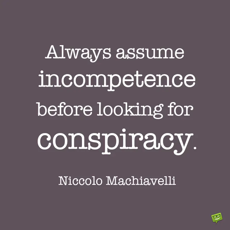 - Always assume incompetence before looking for conspiracy. Niccolo Machiavelli