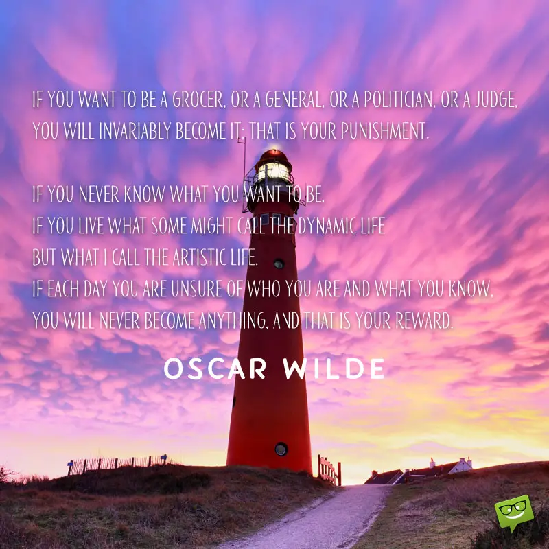 - If you want to be a grocer, or a general, or a politician, or a judge, you will invariably become it; that is your punishment. If you never know what you want to be, if you live what some might call the dynamic life but what I call the artistic life, if each day you are unsure of who you are and what you know, you will never become anything, and that is your reward. Oscar Wilde