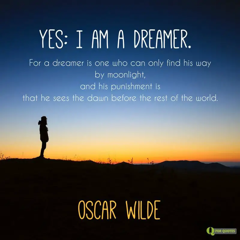 - Yes: I am a dreamer. For a dreamer is one who can only find his way by moonlight, and his punishment is that he sees the dawn before the rest of the world. Oscar Wilde