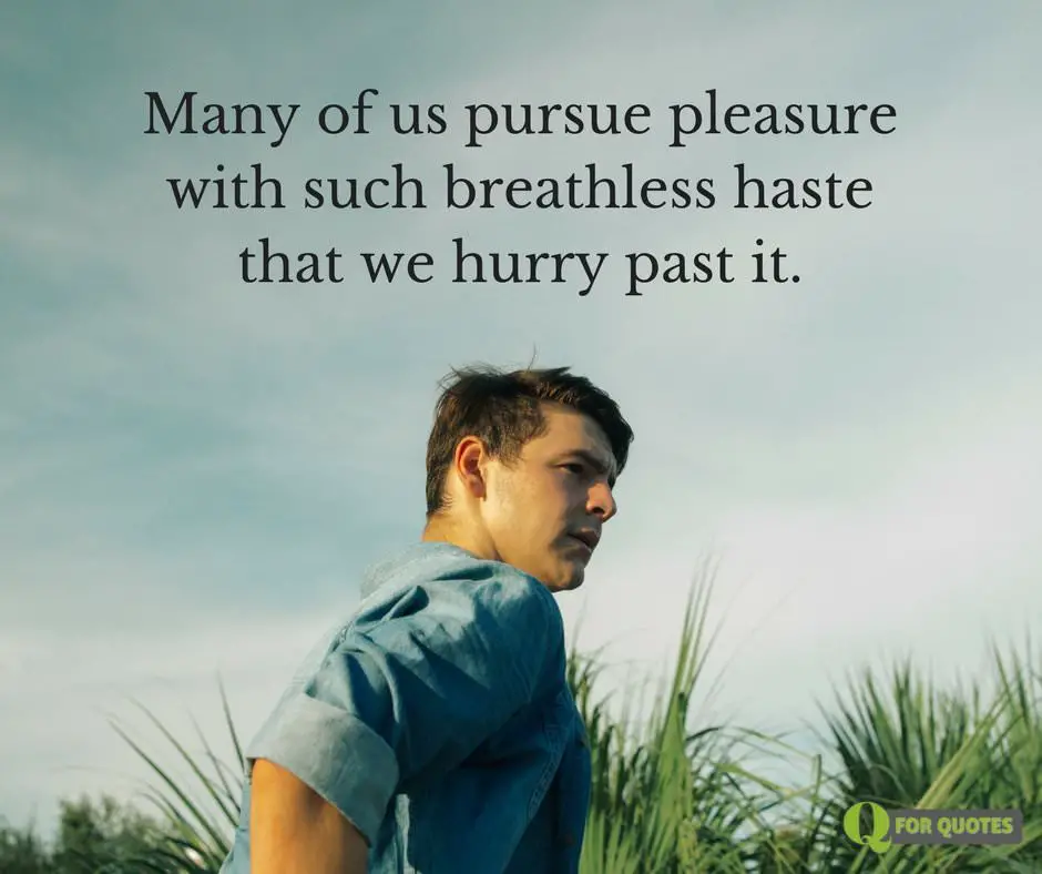 - Many of us pursue pleasure with such breathless haste that we hurry past it. Søren Kierkegaard